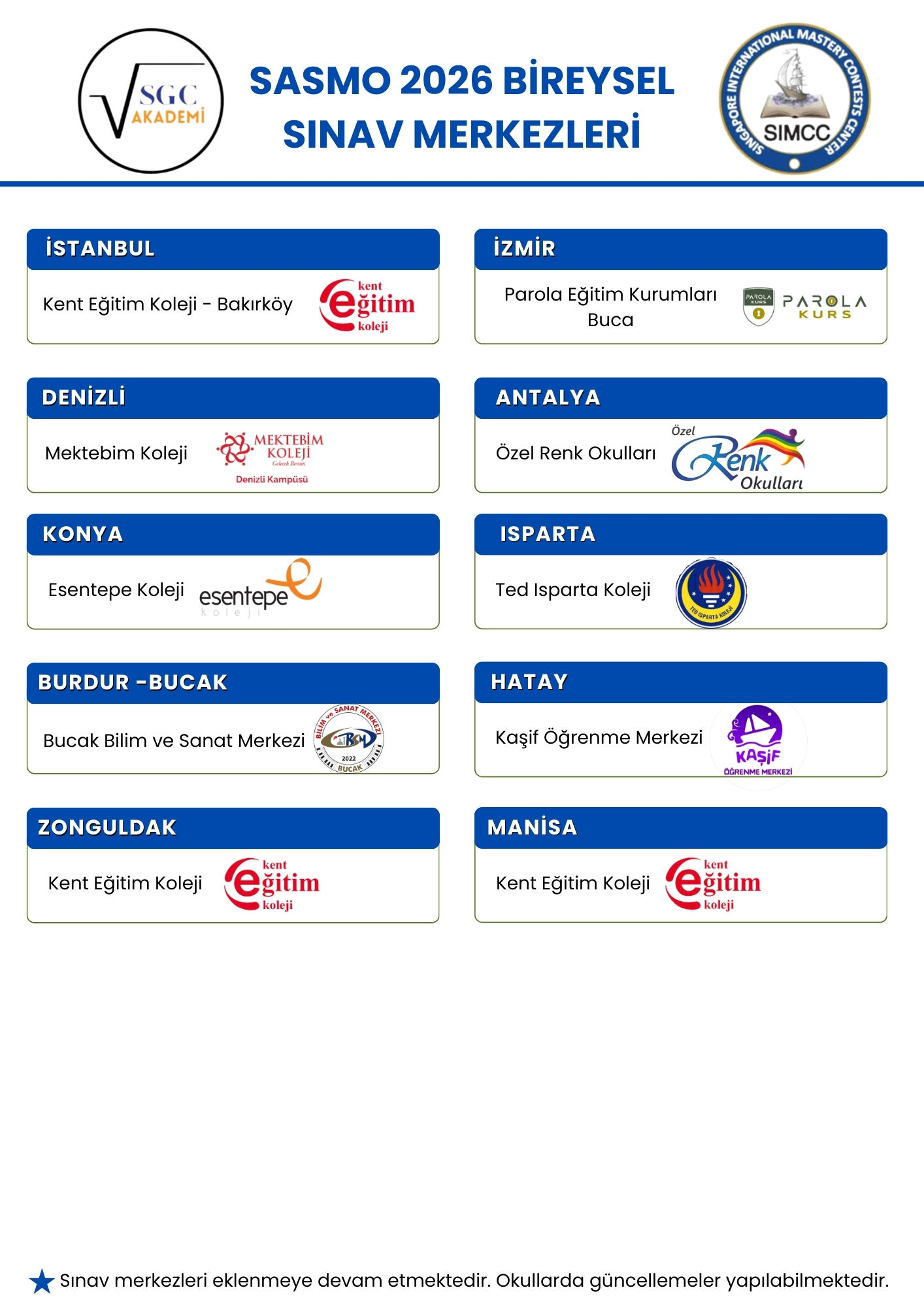 SASMO 2026 Bireysel Sınav Merkezleri